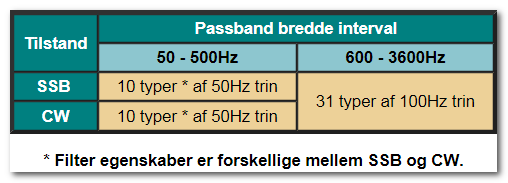 Valgbar filter former hver i SSB og CW tilstande